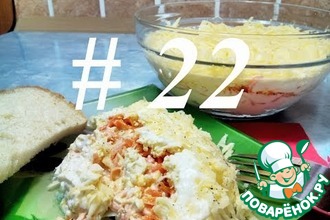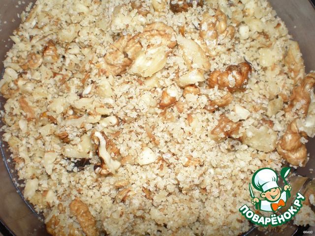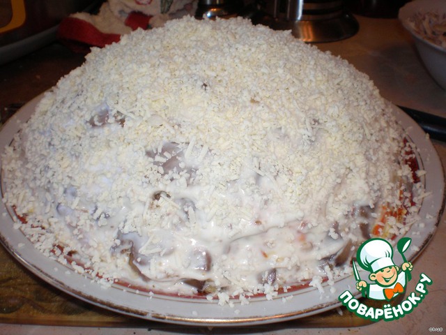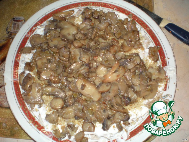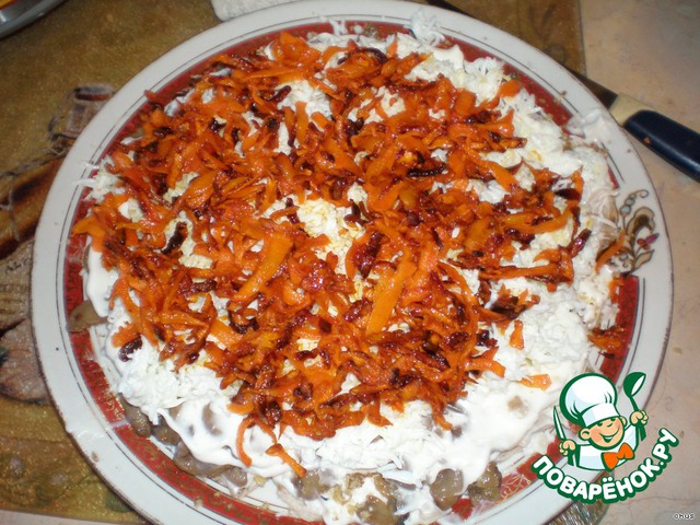 Шестой - марковка - белок. Седьмой - опять курочка - майонез - грецкие орешки - грибы. Последний слой майонезика, украсить желтком.