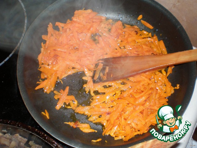 Обжарить мелко порубленный лук на растительном масле до золотистого цвета, добавить к нему грибы, обжарить до готовности. Приправить солью и перцем.