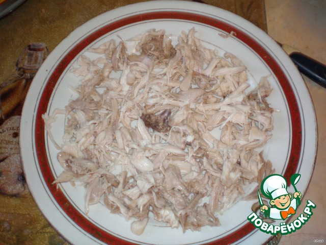 Отварить окорочка. Отделить мясо от костей, разобрать на волокна.