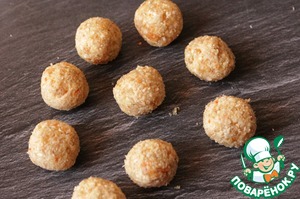 Из получившейся массы скатать небольшие шарики. Количество зависит от размера, как вы понимаете. У меня получается где-то 16-18 "конфет", каждая на один укус.