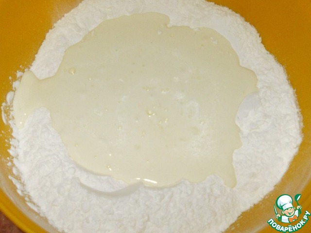 Ввести туда же дрожжи и размешать до однородности. В миску просеиваем 3 стакана муки и вливаем жидкую составляющую.