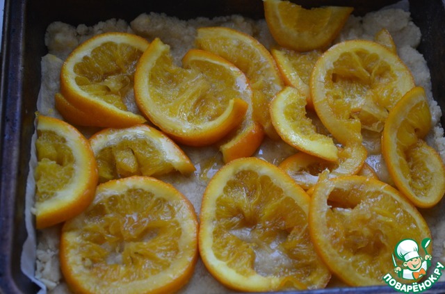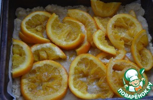 В форму выложите эластичное тесто, апельсины,