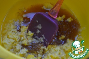 При перемешивании масса из растительного масла, сахара, лимона и соды станет пышной и шипящей.
