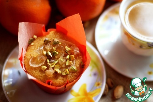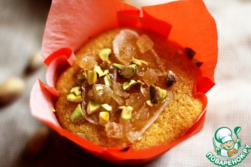 Можно уварить сироп до густого состояния и еще раз смазать верх кексов, чтобы к ним хорошо прилипли рубленные фисташки. Я же нарезала тонкие пластинки мармелада, посыпала фисташками и поставила еще минут на 5 в горячую духовку, чтобы фисташки "приклеились" к кексам.