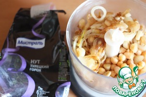 Всё (лук, чеснок и нут) перемолоть при помощи блендера в однородную массу.
