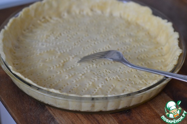 Выкладываем тесто в форму 24см. Формируем высокие бортики. Часто проколоть тесто вилкой. Выпекать в разогретой духовке при 180гр 20 минут.
