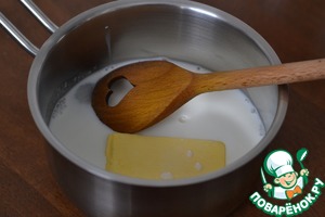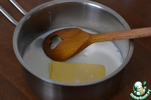 Молоко с сахаром, ванильным сахаром и маслом доведем до кипения. -