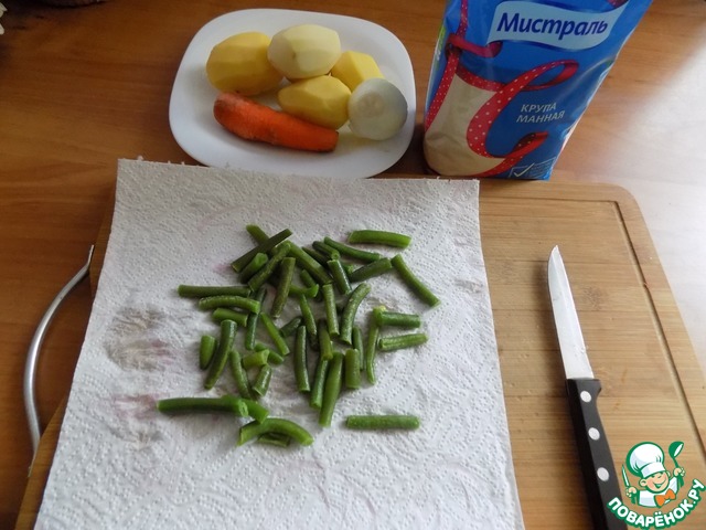 Приготовила овощи, помыла, обсушила. Фасоль разморозила в дуршлаге под водой и промокнула бумажным полотенцем.