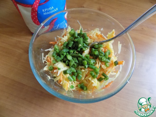 Овощи натёрла на тёрке средней, начиная с луковицы-картофель-м орковь. Чтобы картофель не потемнел для драников, начинаю натирать всегда сначала лук! Фасоль стручковую мелко нарезала.
