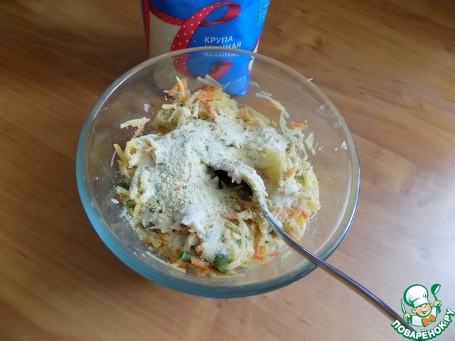 Налив 2 ст. л. масла, перемешала, посолила, добавила специи для овощей и положила манную крупу. Тщательно всё соединила. Вне Поста для связки продуктов можно положить яйцо. Если нет специй для овощей, можно просто поперчить по вкусу и желанию.