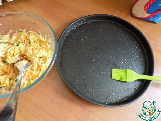 Я буду делать один большой драник. Взяла форму для пиццы антипригарную D-24 см и выложила овощную смесь на предварительно смазанную форму 0,5 ст л масла, несмотря на то, что она антипригарная. Драники хорошо выложить ложкой по одному, так они будут маленького размера и быстрее пропекутся. Это ваше желание.