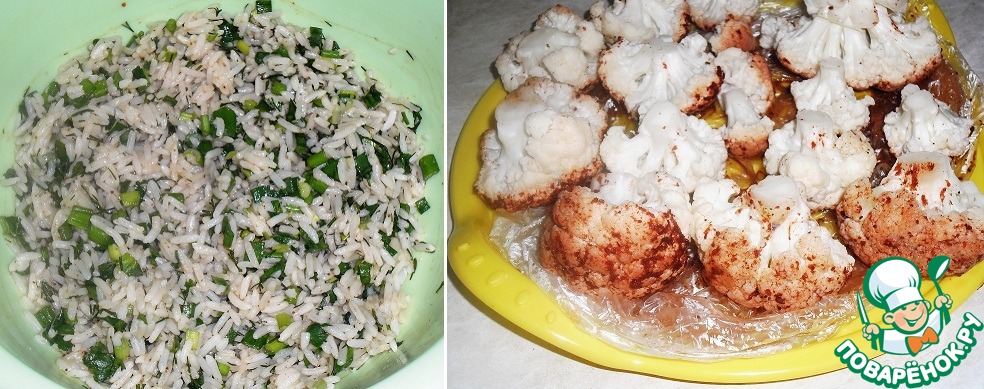Выложила рис, распределила равномерно по всей поверхности, соцветия капусты разложила на рис, слегка придавила, как-бы притопила и сразу отправляем в духовку.