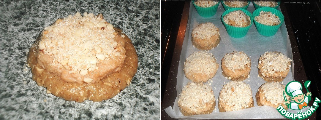 Сверху выложила яблочную смесь по диаметру первого слоя, а в формочках - пирамидкой. Слегка утрамбовала.