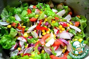 Салат: кукуруза, редиска, листья салата, красный лук, красный болгарский перец, масло подсолнечное, зелень, соль.