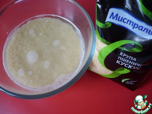 • Для приготовления блюда, я взяла крупу пшеничную кус-кус ТМ "Мистраль". Залейте кус-кус горячей водой в соотношении 1:2 и накройте крышкой.