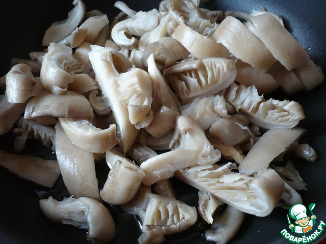 • Теперь приготовим грибы. Вешенки промываем, пересыпаем в дуршлаг и даём воде стечь, чтобы в них не осталось лишней влаги. Режем грибы на куски. Ставим на огонь сковороду с растительным маслом, выкладываем грибы в сковороду и не забываем их помешивать.