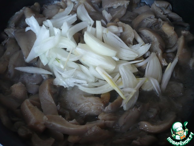 • Очистить и нарезать пёрышками лук. После 3-4 минут обжарки грибы уже отдали влагу и начали румяниться – самое время добавить к ним лук. Обжаривам теперь грибы вместе с луком, время от времени помешивая. Затем добавить к грибам щепотку черного, молотого перца и соевый соус. Хорошо всё перемешать. Через 1 минуту огонь уже можно выключать.