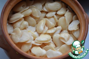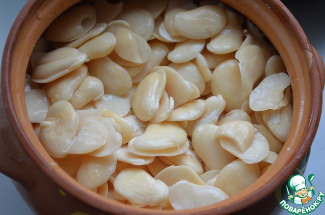 Фасоль помойте, высыпьте в чашку, добавьте 0,5 ст. л. соли, залейте кипятком и закройте крышкой. Дайте постоять 6 часов, фасоль за это время набухнет. Очистите от шелухи