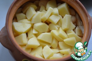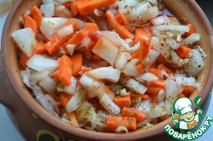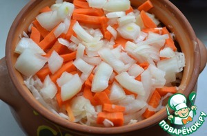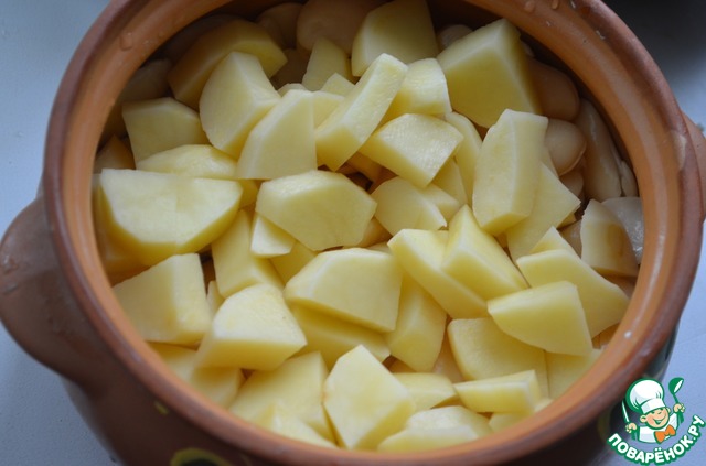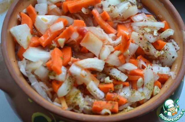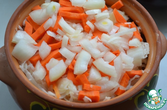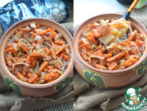 В горшочки слоями выложите фасоль, картофель, квашеную капусту, морковь, лук и чеснок.