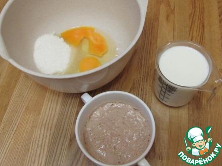 В широкую посуду всыпаю сахар, вбиваю яйца, добавляю кислое молоко и 3-4 столовых ложки муки из общего указаного количества. -
