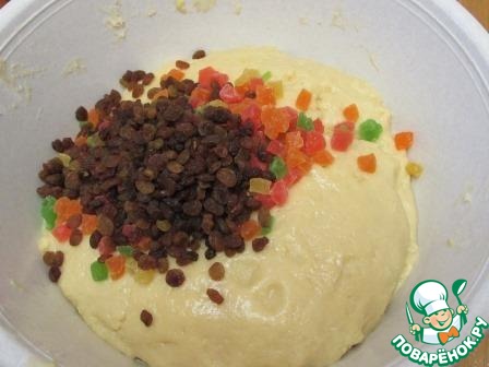 В вымешаное тесто добавляю изюм и цукаты, опять всё тщательно вымешиваю до однородного распределения изюма и цукатов.