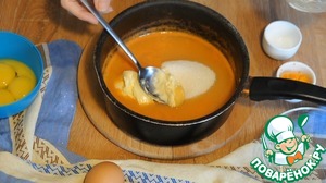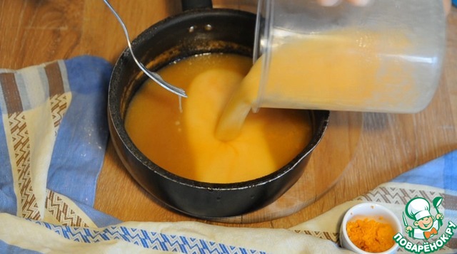 Займемся начинкой. В сотейник выливаем апельсиновый сок и варим на сильном огне, пока не выпарится примерно половина жидкости. Затем добавляем в сотейник сахар, масло и соль. Варим помешивая на среднем огне до полного растворения масла и сахара.