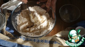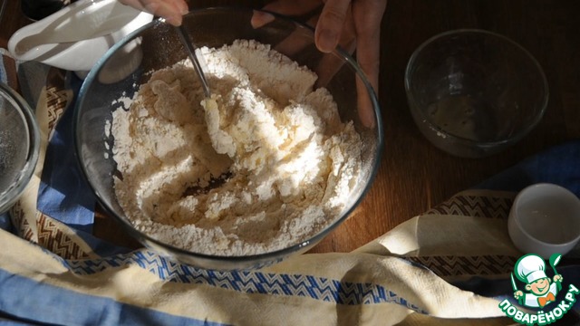 В глубокую миску просеиваем муку, добавляем сахар и щепотку соли, размягченное сливочное масло, перемешиваем. В отдельной емкости вилкой взбиваем желток и воду, выливаем к муке и сахару. Замешиваем тесто.