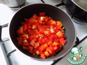 Добавляем болгарский перец маленьким кубиком. Томим почти до готовности примерно 5 минут тоже под крышкой. Можно добавить пару ложек бульона из кастрюли, где варится рис.