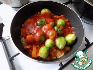 Капуста брюссельская варится очень быстро, особенно мороженная. Мы её выкладываем последней, томим с минуту и выкладываем протёртые помидоры, которые можно заменить на 2 шт свежих, если нет протёртых.