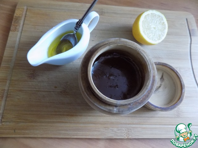 Делаем заправку для салата. Наливаем оливковое масло, отжимаем сок лимона, добавляем мёд. Соединяем и солим по вкусу по желанию.