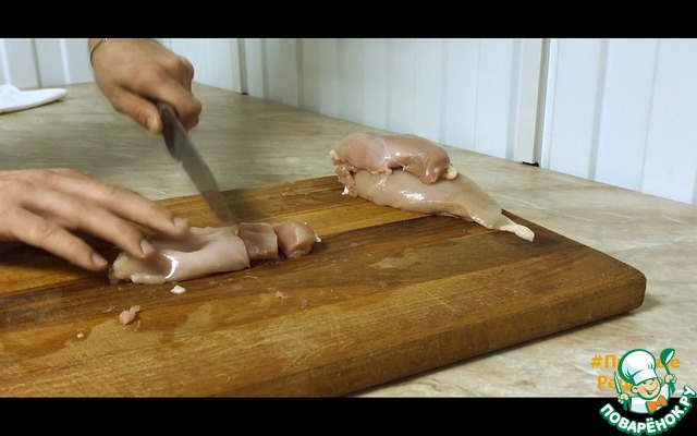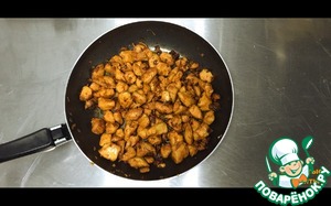 Первым делом порежем куриное филе кубиками и обжариваем до появления золотистой корочки.