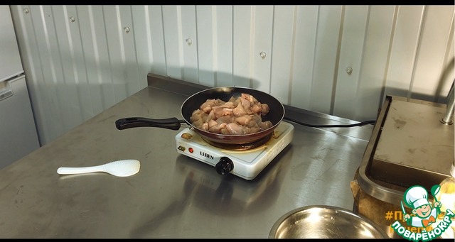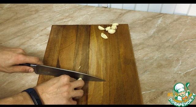 Пока жарится курица, нарезаем чеснок мелкими кусочками и после того, как на курице появится корочка, добавляем чеснок и обжариваем минут 5.