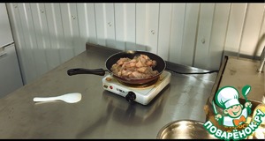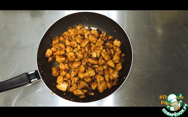 Добавляем наш соус к курице, всё перемешиваем и на медленном огне оставляем ещё на минут 5.