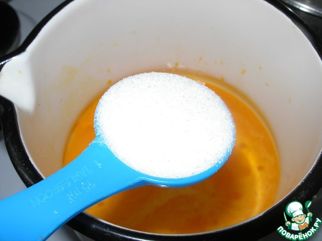 150 мл свежевыжатого мандаринового сока поставить на маленький огонь и добавить 2 ст. л. сахара., помешать до растворения.
