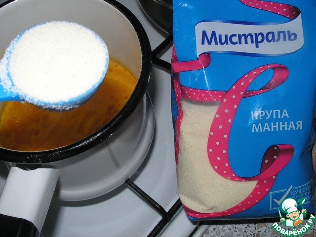 Теперь добавляю постепенно 3 ст. л. манной крупы ТМ "Мистраль", постоянно помешиваю, чтобы не образовалось комочков. Проварить около 5 минут на малом огне, дать полностью остыть.