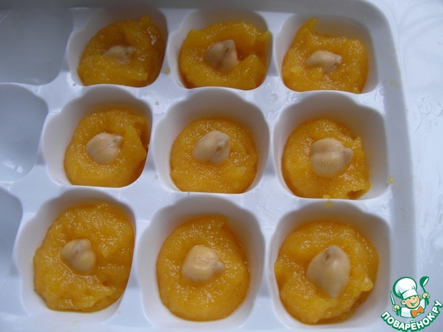А вот и гвоздь программы - нут ТМ "Мистраль", который необходимо замочить заранее на ночь. Замоченный нут кладу в середину, а теперь закрываю его мандариновой массой до краёв формы. Отправляю в морозилку минут на 15-20. -