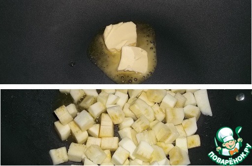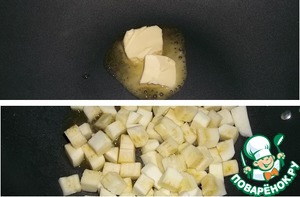 В сотейнике или глубокой сковороде (воке) растопить сливочное масло. Обжаривать кабачок, помешивая, до полуготовности. -