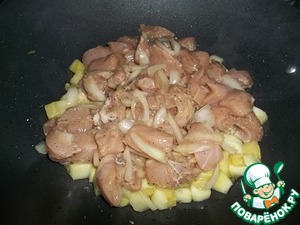 Добавить курицу с луком, перемешать, накрыть крышкой.