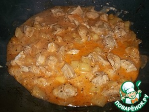 Добавить томатную пасту (крышкой больше не накрывать), через пару минут - табаско и соус карри, затем сметану.