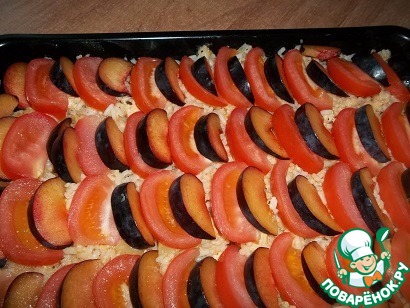 Противень немного нагреть, чтобы было удобно смазать его сливочным маслом, выложить рисовую заготовку. Сверху разложить, чередуя, нарезанные тонкими ломтиками сливы и помидоры.