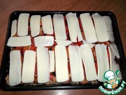 Накрыть нарезанными пластинами сыра сулугуни, поставить в разогретую до 200 градусов духовку. Запекать до тех пор, пока сыр не расплавится.