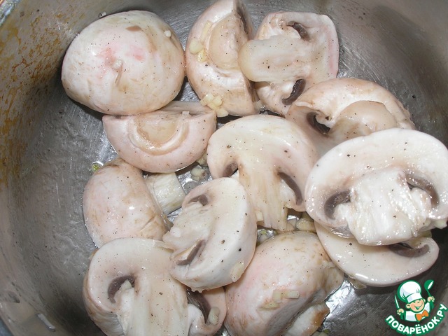 Пока тесто отдыхает, займусь маринадом для грибов: смешиваю виноградный уксус, растительное масло, щепотку чёрного перца и соли, измельчаю чеснок, теперь добавляю сюда порезанные пополам шампиньоны. Оставляю их на минут 20 в маринаде.