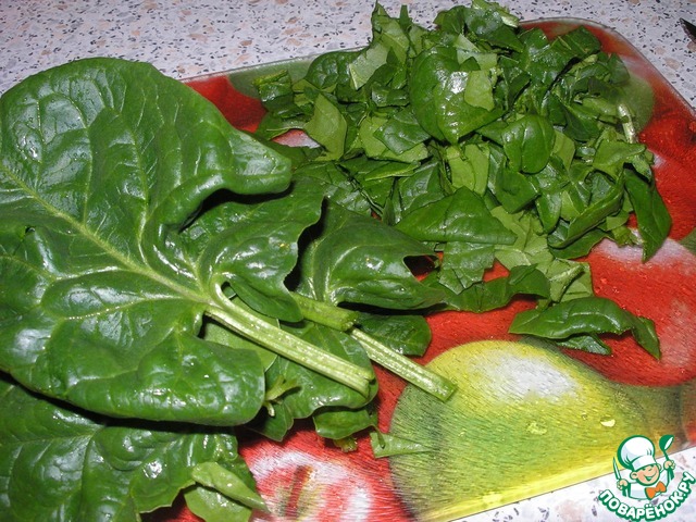 В это время приготовлю остальную начинку. А именно порежу довольно крупно промытый шпинат.