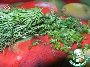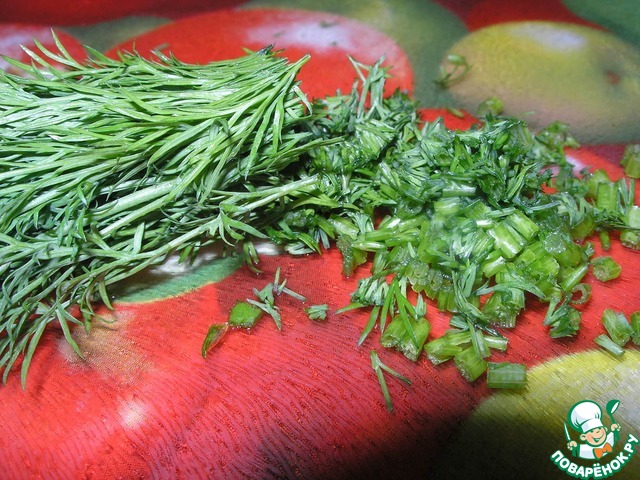 Смешиваю в миске с порезанными шпинатом, укропом и кабачком.