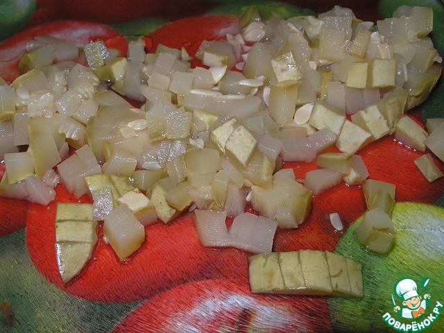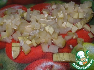 Кубиками нарезаю маринованный кабачок или можно небольшой маринованный огурчик.