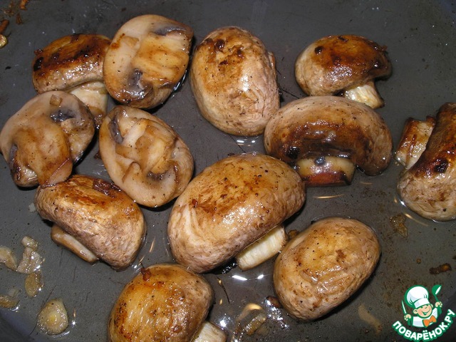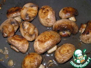 Обжариваю замаринованные шампиньоны на растительном масле около 15 минут до румяности.