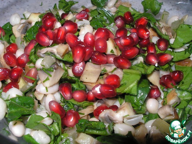 Грибочки нарезаю кубиками и вместе с зёрнами граната отправляю в миску к остальной начинке. Всё тщательно перемешать и начинка уже готова.