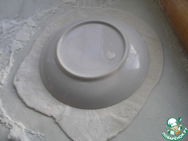 Осталось разделить на равные порции тесто, раскатать его тонко, толщиной не более 1 мм, вырезать с помощью блюдца круги для будущих кутаб.