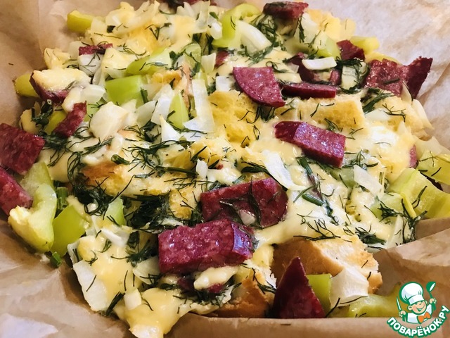Режем мелкими кубиками почищенные и мытые болгарский перец и лук. Колбасу нарезать крупными кубиками.