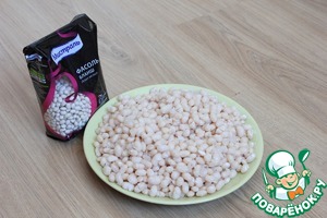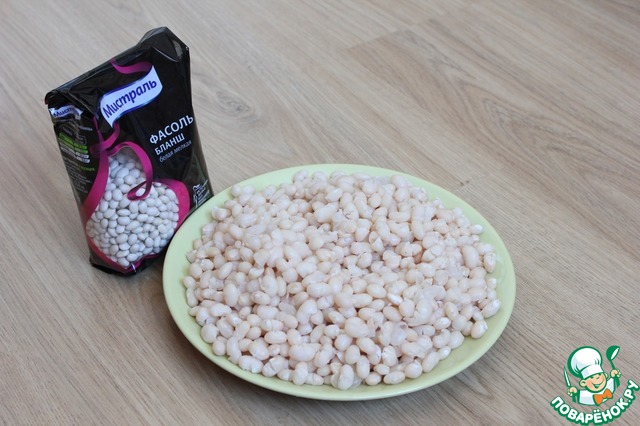 Белую фасоль предварительно замачиваю на 4 часа. Затем заливаю водой в пропорции 1:5 и варю до готовности (около 50-60 минут).